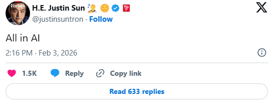 即便如此,孙宇晨依然对人工智能与区块链的融合前景保持乐观,他认为二者的深度协同是行业最具潜力的长期发展方向之一,而这一潜力的释放,关键在于开发者能够推出兼具实用性与落地性的工具,摆脱单纯的实验性探索,让技术真正服务于实际需求。为践行这一理念,孙宇晨近期已推出AINFT.com,将“All in AI”的规划逐步落地,推动技术探索从概念走向实践。